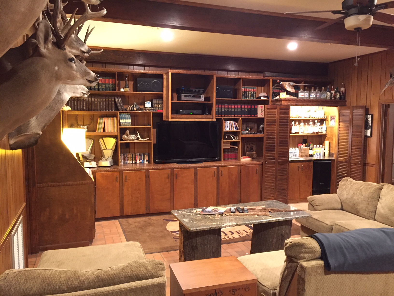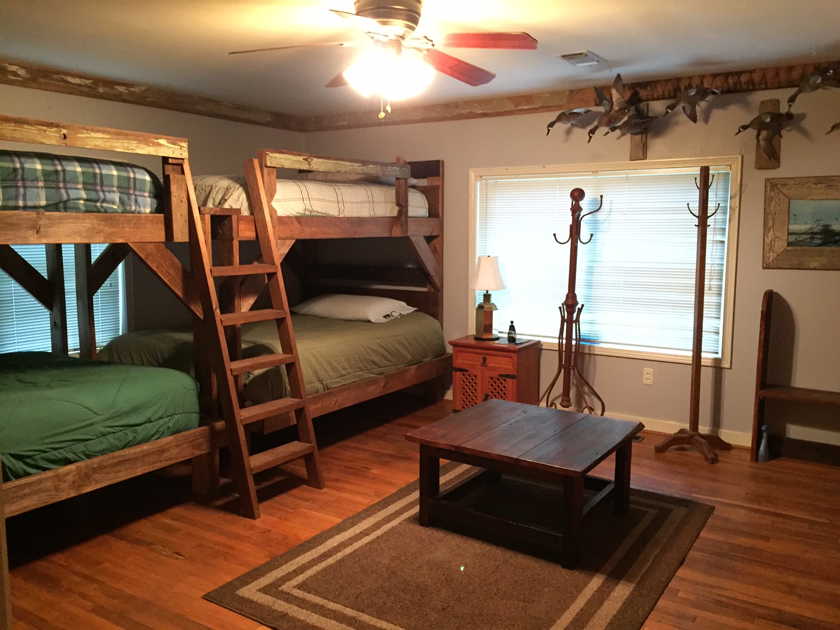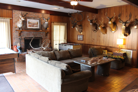 | The main lodge is a 3500 sq ft brick home with 4 bedrooms, 3 bathrooms, 3 dens, kitchen, dining room, and 1000 sq ft covered patio. The lodge is located right on the highway and is very comfortable. Amenities include 3 dog kennels, game cleaning station, wet bar, digital satellite TV, central air/heat, washer/dryer and sleeping quarters for 24 people. You may choose to stay in either the main lodge or camphouse; you will be more than comfortable in each. | |